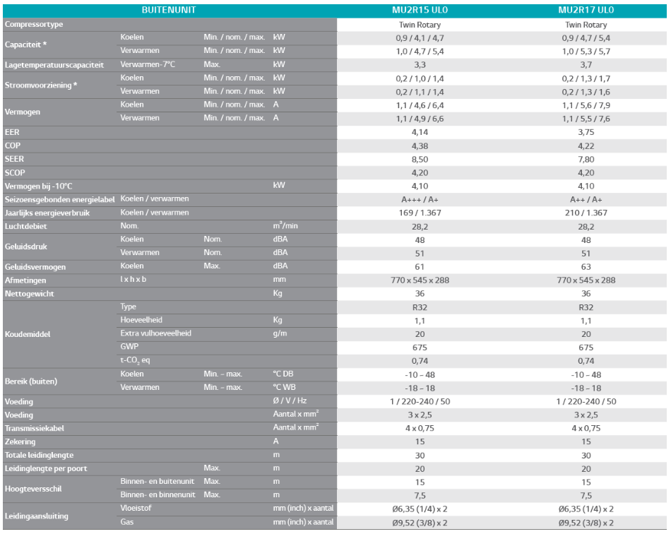 Op deze buitenunit kunnen maximaal 2 binnendelen aangesloten worden, met een maximale capaciteit van 21.000 BTU.